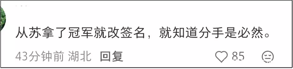 从情侣角度来说,苏翊鸣把情侣个性签名更换成与感情无关的内容的确不是好寓意。不过,也不能单凭拿了冠军更改个性签名就推断苏翊鸣想分手,毕竟苏翊鸣四年前就是奥运冠军了。