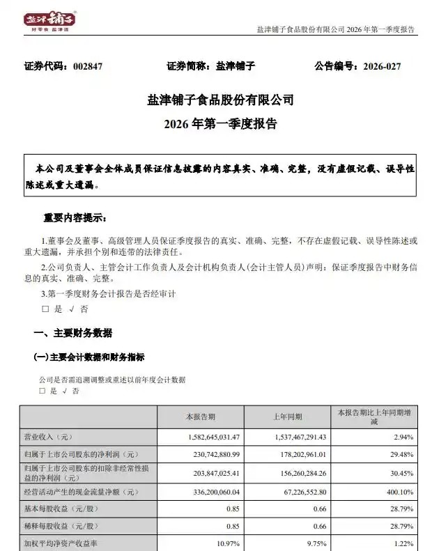 4月28日晚间,盐津铺子(002847.SZ)披露2026年一季报。报告期内,公司实现营收15.83亿元,同比增长2.94%;归母净利润2.31亿元,同比增长29.48%。2026开局,盐津铺子单季度延续了收入增长、利润快增的态势,毛利率和利润率继续提升,盈利质量进一步改善。