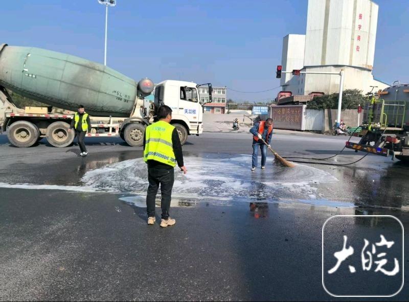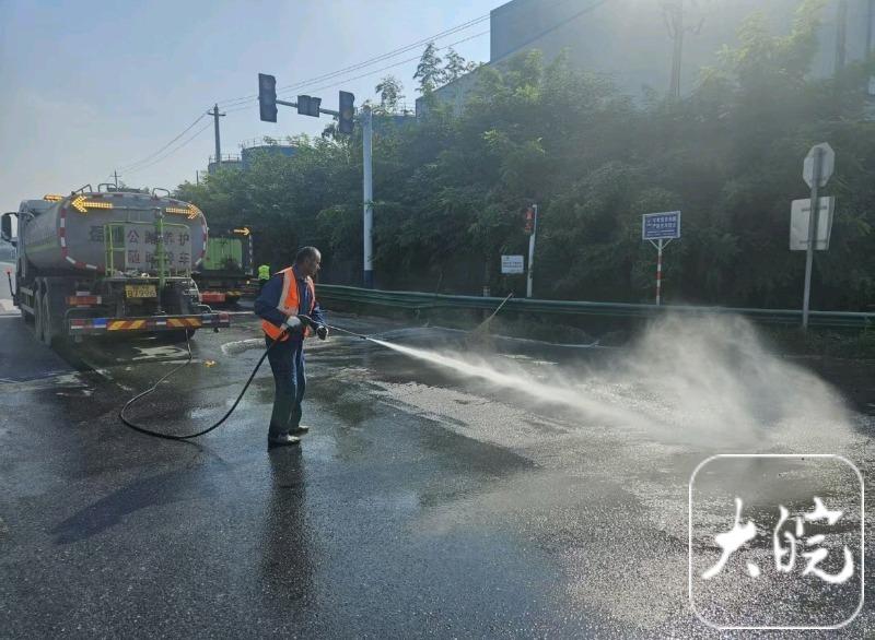 抵达现场后,参与处置的工作人员立即设置安全警示标志,引导过往车辆减速避让,划定安全作业区域。同时,抢险团队分工协作,一边使用专业设备对泄漏柴油进行吸附、收集,一边对受污染路面进行高压冲洗和防滑处理,避免因路面湿滑引发二次事故。